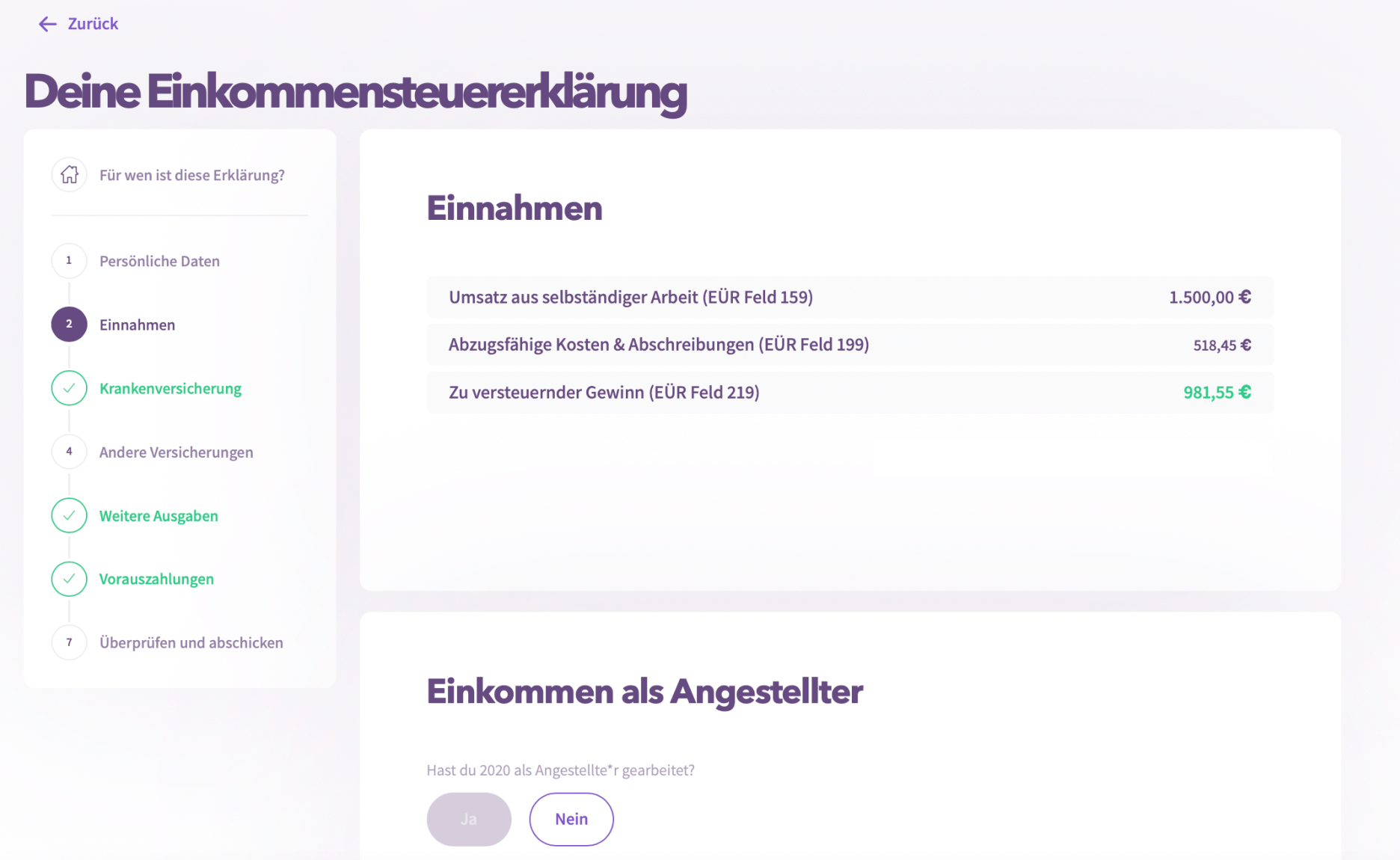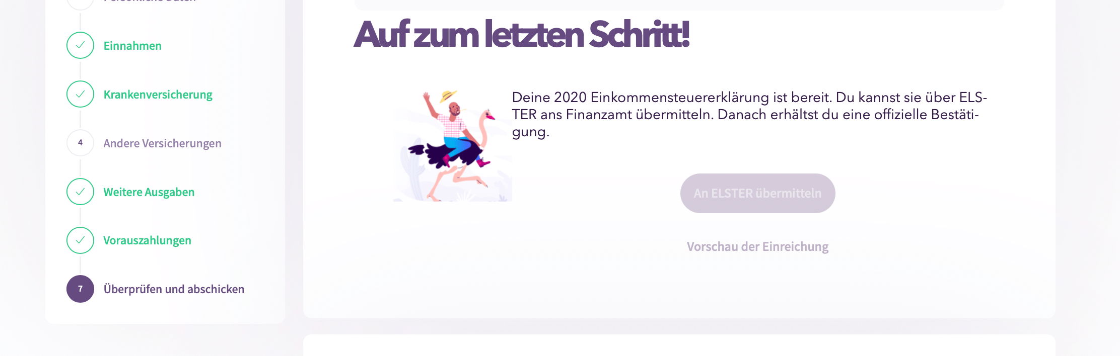 Hier kannst du Daten zu eventuellem Angestellteneinkommen, Krankenversicherung usw. angeben. Zum Schluss kommst du auch hier zur Seite "Überprüfen und abschicken", auf der du deine Einkommensteuer direkt an ELSTER übermitteln kannst. Damit hast du alles erledigt und deine gesamte Steuer für das Jahr vollständig abgeschickt!