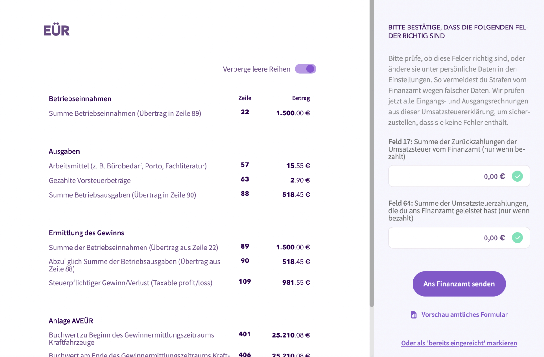 Hast du über das Jahr fleißig deine Einnahmen und beruflichen Ausgaben in der Accountable App erstellt oder eingefügt, wird deine EÜR daraus automatisch berechnet. Jetzt musst du nur noch die EÜR in der Web Version einreichen. Klicke dafür einfach auf "Ans Finanzamt senden". Super, der erste Schritt ist schon geschafft!