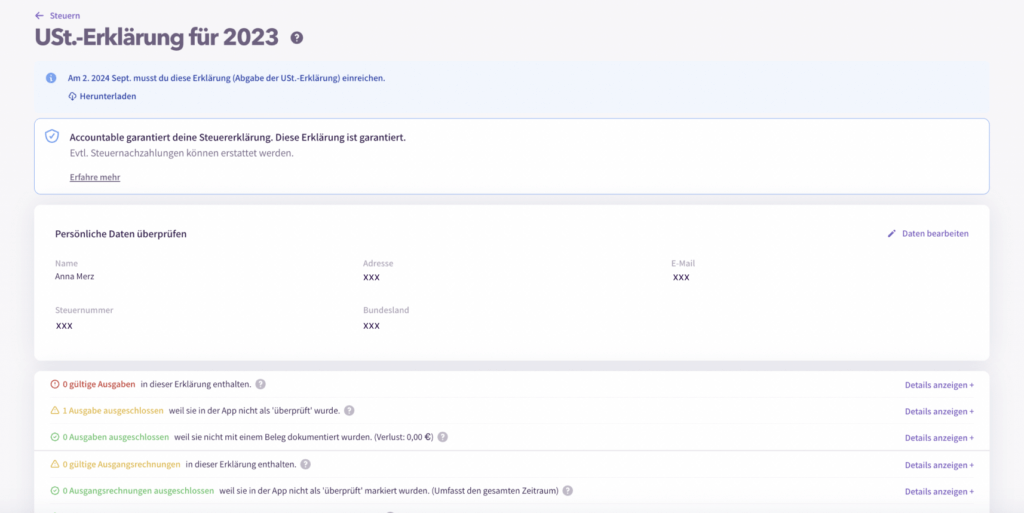 💡Tipp von Accountable: Wenn du von der Kleinunternehmerregelung Gebrauch machst, musst du während des Jahres keine Umsatzsteuer-Voranmeldungen machen. Trotzdem ist die Abgabe der Umatzsteuerjahreserklärung auch für dich verpflichtend. In diesem Fall, kontaktiere einfach unser Team und wir helfen dir weiter.