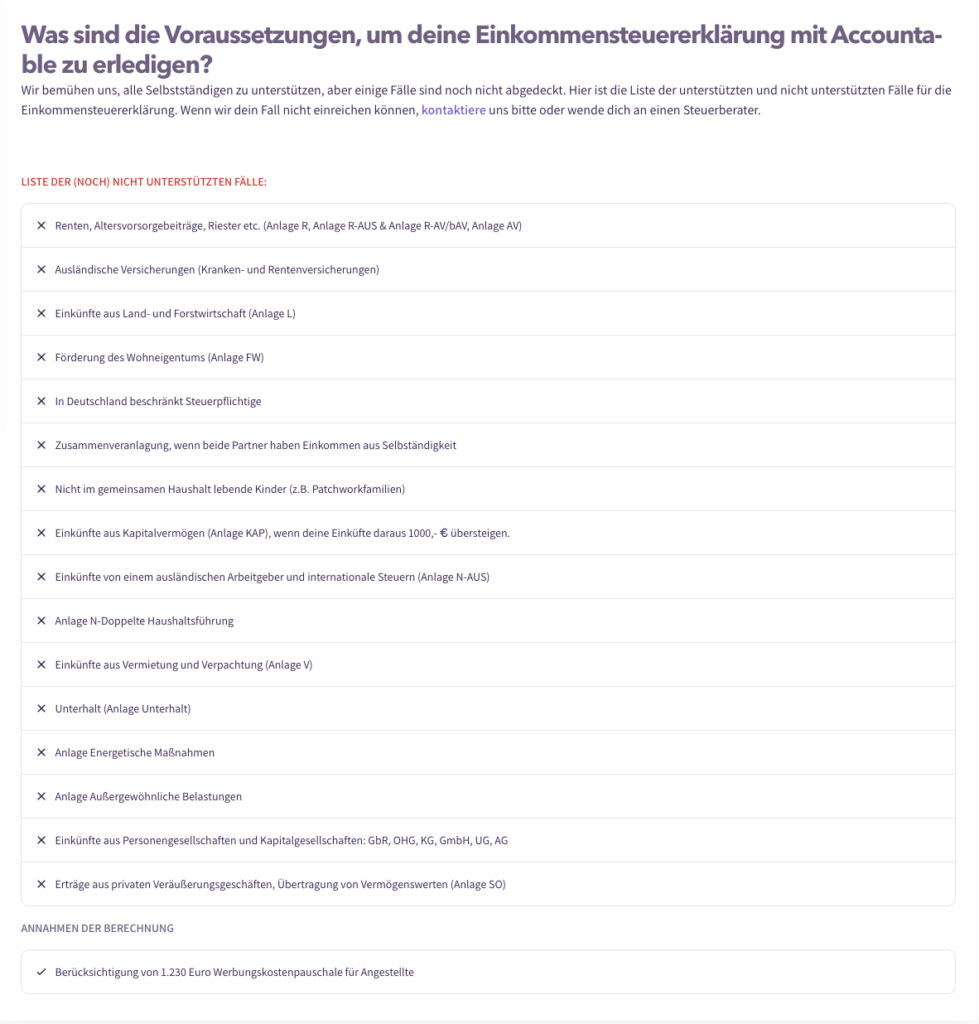 Mit Accountable kannst du nicht nur deine Umsatzsteuer einreichen und deine Buchhaltung erledigen - du kannst auch deine jährliche Einkommensteuererklärung erstellen. Momentan deckt Accountable noch nicht alle Sonderfälle ab, hier findest du die Liste mit den (noch) nicht unterstützen Fällen.