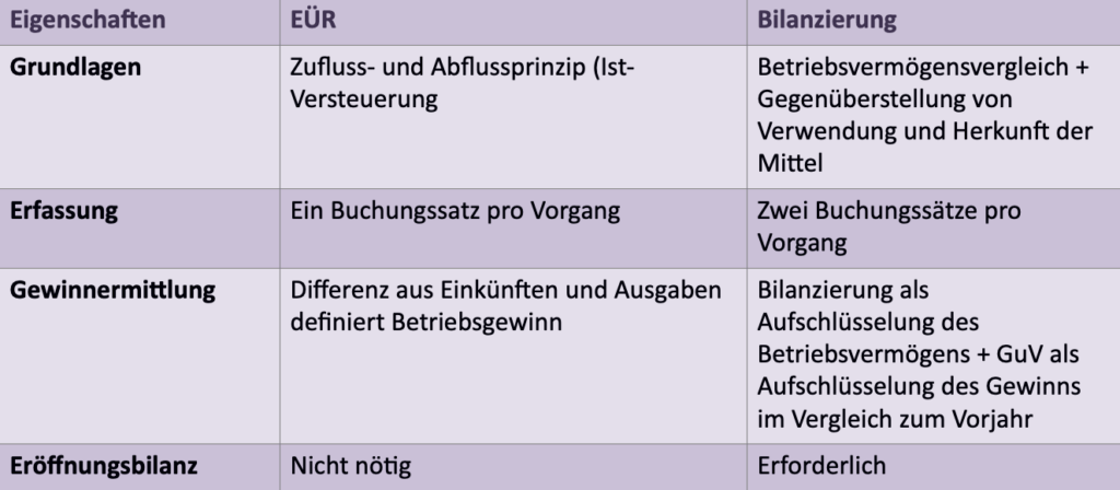 Während die EÜR nur Posten und Geschäftsvorgänge berücksichtigt, die ein- oder abgehen, umfasst die Bilanzierung auch ausstehende oder anzumahnende Zahlungseingänge und Kosten. Für eine vorausschauende Finanz- und Liquiditätsplanung bietet eine Bilanzierung daher mehr Überblick über den Gesamtzustand des Unternehmens.