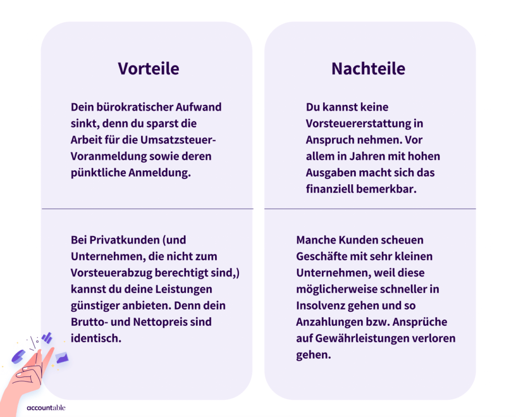 💡 Tipp von Accountable: Wenn du erst nach Aufnahme deiner selbstständigen Tätigkeit die Kleinunternehmerregelung beantragen möchtest, kann es sinnvoll sein, den entsprechenden Antrag erst zu Beginn des neuen Kalenderjahres zu stellen. Dadurch gilt die Regelung für das gesamte Jahr und du musst nicht für einzelne Monate Umsatzsteuer zahlen.