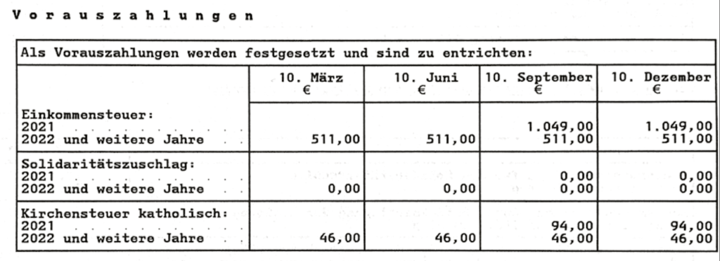 Als nächstes siehst du, wann du diese Zahlungen zu leisten hast und wie viel du bezahlen musst. Es wird meistens in Form einer Tabelle dargestellt, in der du die unterschiedlichen Steuerarten links siehst und der Zeitraum, in dem sie fällig sind, oben angegeben wird. Hier siehst du also, wie viel du jeweils zahlen musst und wann die Fristen dafür sind.