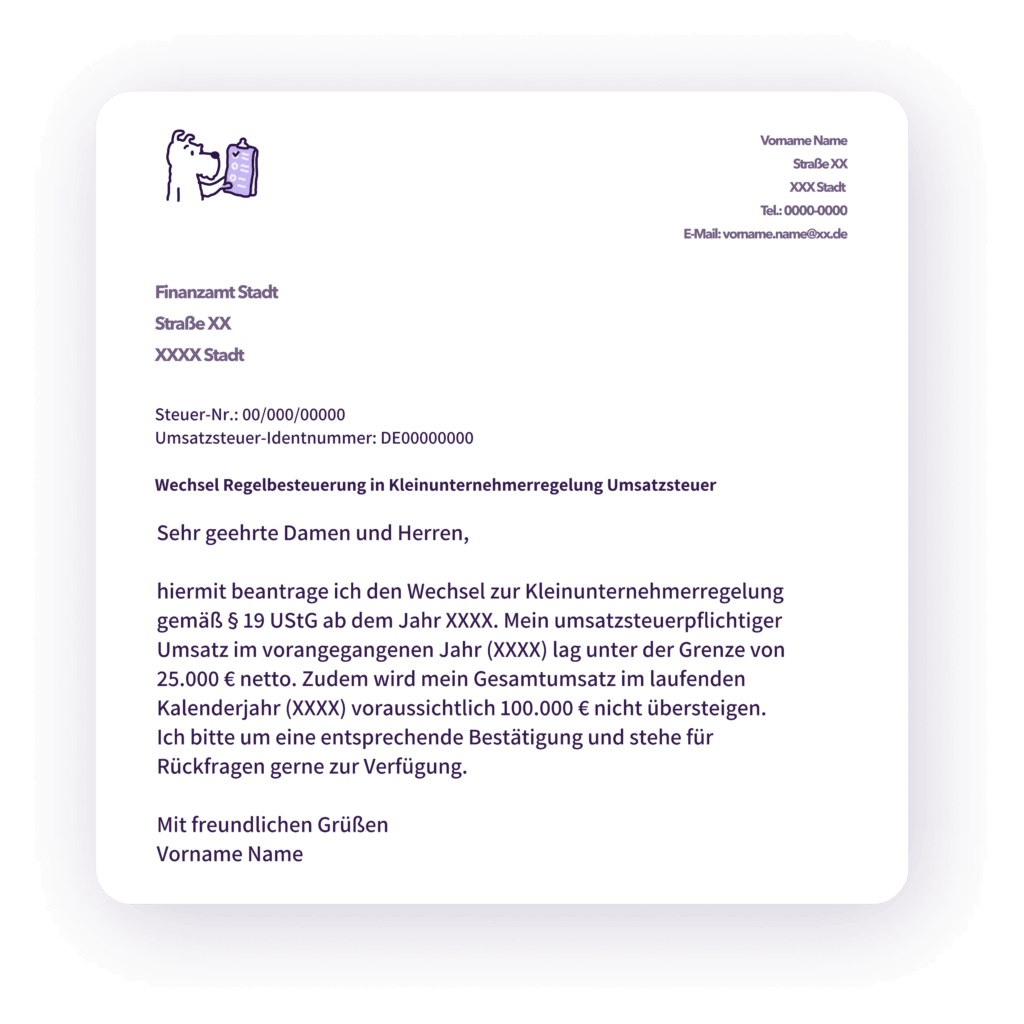 Für den freiwilligen Wechsel musst du keinen Antrag stellen. Sobald du damit beginnst, eigenständig Umsatzsteuer auszuweisen und ans Finanzamt zu überweisen, gilt dies als offizieller Verzicht auf die Kleinunternehmerregelung.