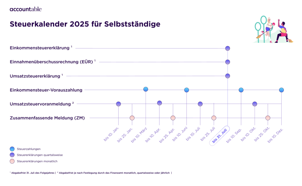Zusätzlich zur Einkommensteuererklärung musst du auch daran denken, die jährliche Umsatzsteuererklärung und die EÜR (Einnahmenüberschussrechnung) einzureichen. Die Fristen sind identisch mit der Einkommenssteuererklärung.