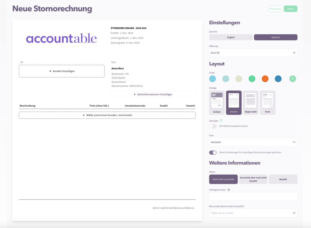 💡Tipp von Accountable: Mit der App von Accountable erstellst du kostenlos Stornorechnungen. Außerdem kannst du E-Rechnungen, Angebote und deine kompletten Steuererklärungen damit erledigen. Teste es jetzt kostenlos!