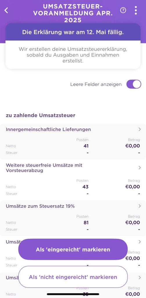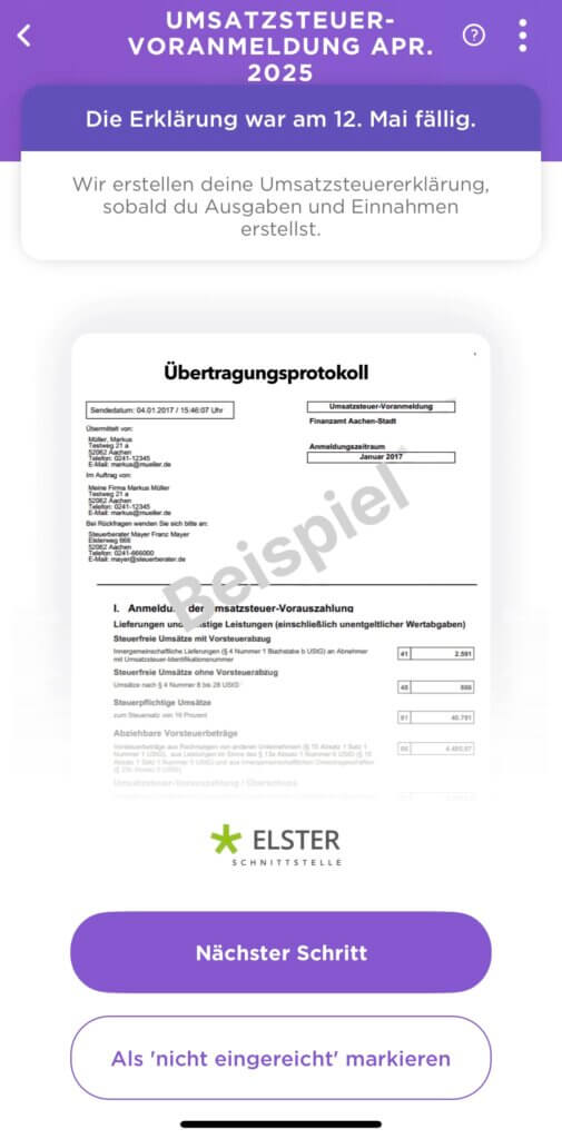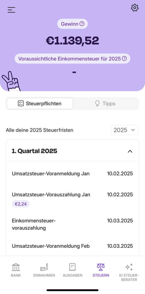 Im Reiter Steuern findest du immer alle für dich relevanten Abgabefristen für deine Steuererklärungen auf einen Blick. Hier wird dir auch angezeigt, wann deine nächste Umsatzsteuervoranmeldung fällig ist.