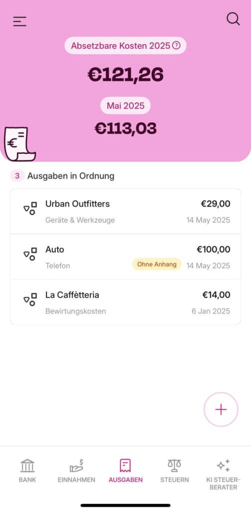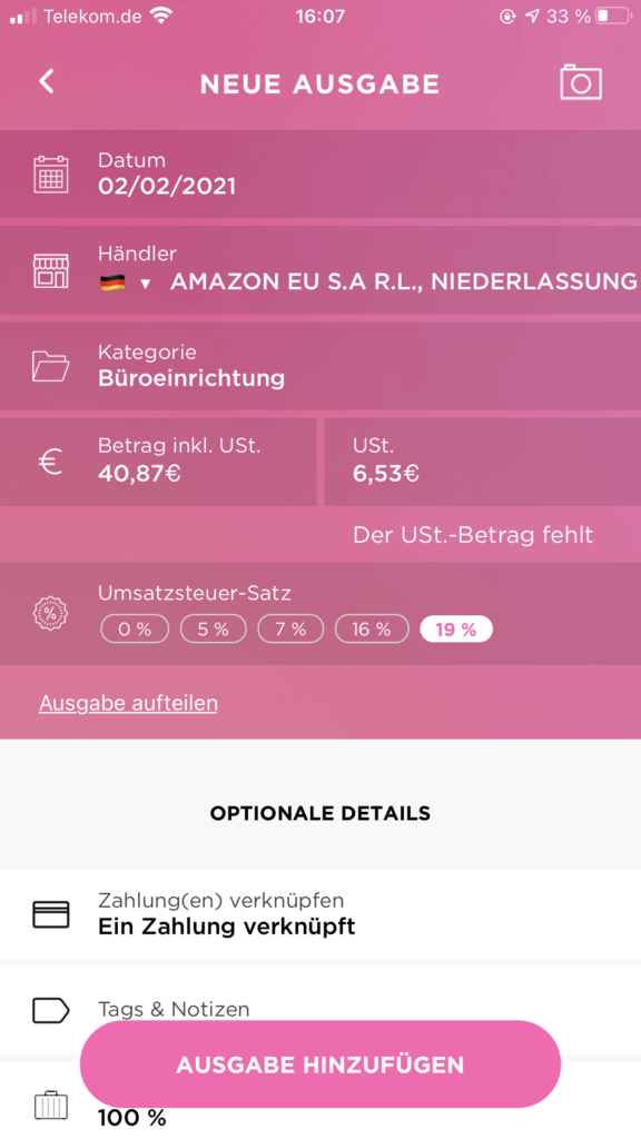 Neue Ausgaben sind in wenigen Minuten erstellt und der entsprechende Betrag für deine Steuern wird automatisch von deiner Steuerlast abgezogen.