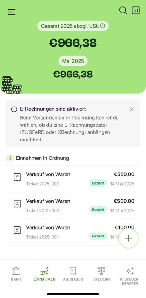 So sieht die Liste deiner Einnahmen in Accountable aus. Du kannst hier Rechnungen und E-Rechnungen erstellen, Stornorechnungen schreiben oder auch direkt Einnahmen ohne Rechnung verbuchen, z.B., wenn du Bareinnahmen hast.