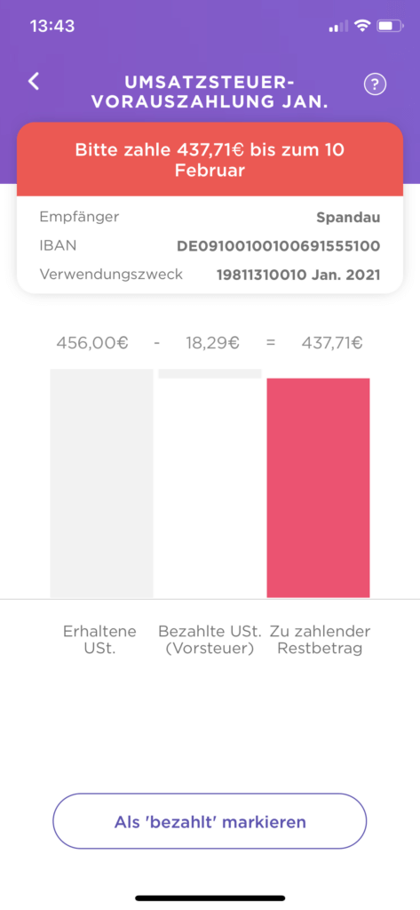 Jetzt musst du nur noch deine Umsatzsteuervorauszahlung an das Finanzamt überweisen. Accountable kalkuliert dabei automatisch die fällige Summe für dich und zeigt dir außerdem direkt die Kontodaten des Finanzamts für die Überweisung an. Sobald du das Geld überwiesen hast, kannst du die Umsatzsteuervorauszahlung für den entsprechenden Monat als bezahlt markieren und dich wieder voll und ganz auf deine Arbeit konzentrieren.