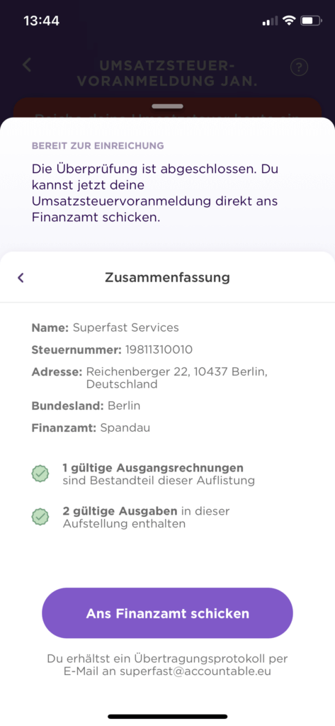Sobald die Überprüfung abgeschlossen ist, kannst du deine Umsatzsteuervoranmeldung direkt an dein Finanzamt schicken. Ein Protokoll der Übertragung wird dabei automatisch an die von dir hinterlegte E-Mail-Adresse geschickt.