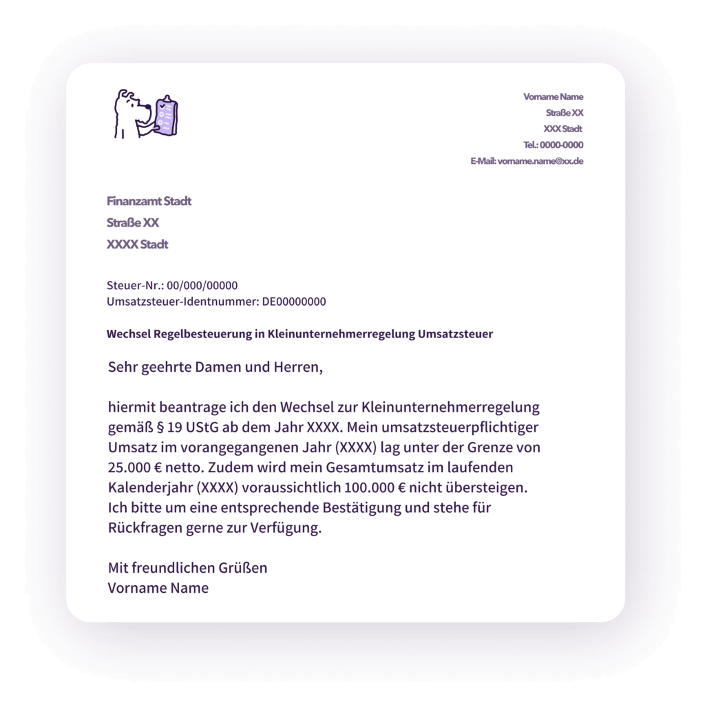 Für den Wechsel zurück in die Kleinunternehmerregelung genügt eine formlose Mitteilung an dein Finanzamt. Anschließend kannst du dann ab dem nächsten Kalenderjahr wieder darauf verzichten, die Umsatzsteuer auszuweisen. Natürlich gilt dies nur, wenn du dann weniger als 25.000€ Umsatz machst. Auch kannst du umgekehrt dein Finanzamt mit einem solchen Schreiben informieren, dass du auf die Kleinunternehmerregelung verzichtest. Eine solche Mittelung ist aber keine Pflicht.