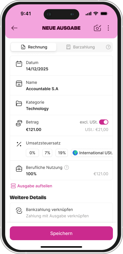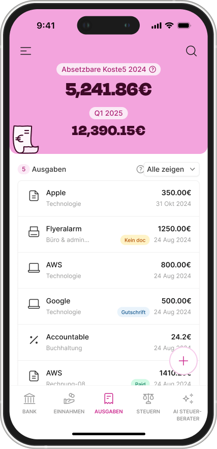 Du hast nun eine Übersicht, was du alles absetzen kannst. Doch wie kannst du Ausgaben nun konkret speichern und absetzen? Am besten nutzt du eine Steuersoftware wie Accountable. Denn so hast du immer den Überblick und vergisst auch nie, eine Ausgabe, die du absetzen kannst. Das Eintragen in Accountable ist einfach und geht sogar on-the-go. Wir zeigen dir am Beispiel der Smartphone-App, wie einfach es ist, deine Geschäftsausgaben per App korrekt zu erfassen: