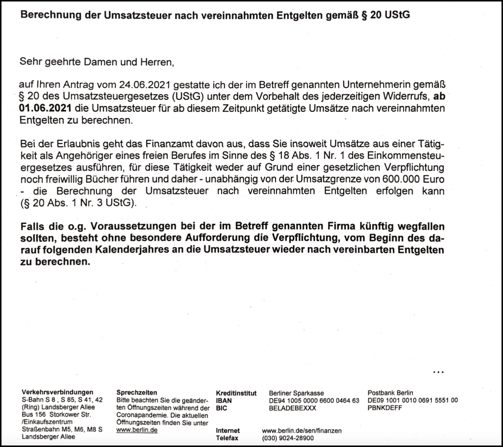 Upon your freelance registration, you have to choose one of the two taxation types. Your choice will then be acknowledged by the tax office in a letter: