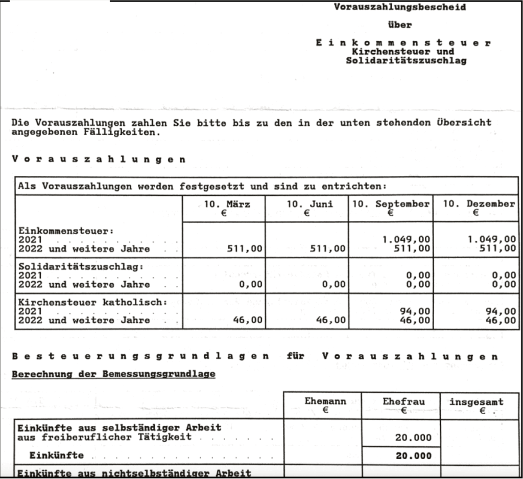 Which is why self-employed people in Germany usually have to pay tax prepayments based on their income from the previous year. The tax office will issue a letter telling you how much they have assessed, including the dates these payments will be due for payment.