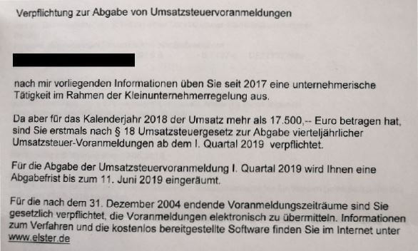 You will probably receive at least two letters from the tax office regarding VAT: One letter for you to choose which type of taxation to apply, and a notification in case you are registered as a small business owner and your income has exceeded the VAT exemption threshold.