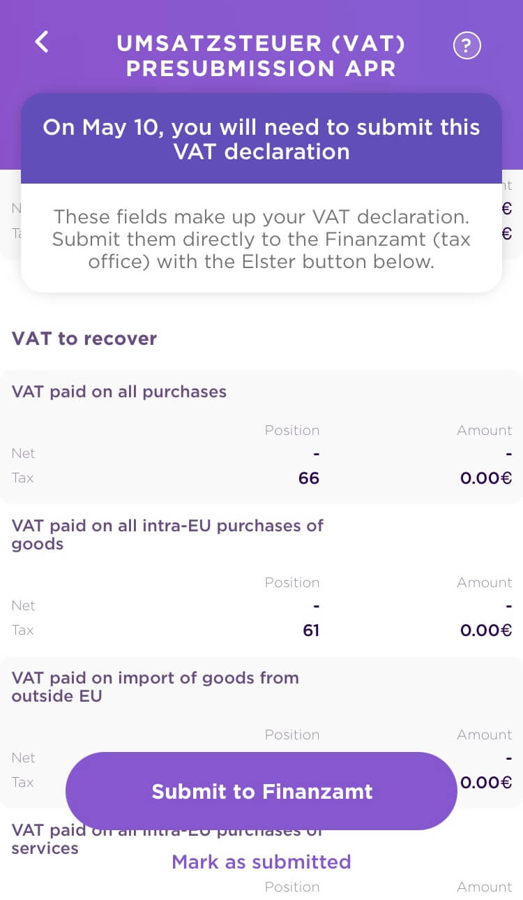 By clicking on the corresponding VAT return, you will find an overview of the relevant data, which you then transmit directly to your Finanzamt via our official ELSTER interface. You don't need an extra ELSTER account for it. Click on "Send to Finanzamt" to have your data checked once again.