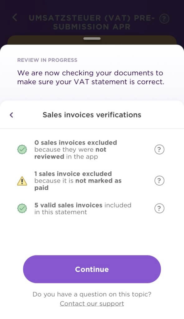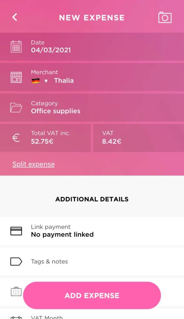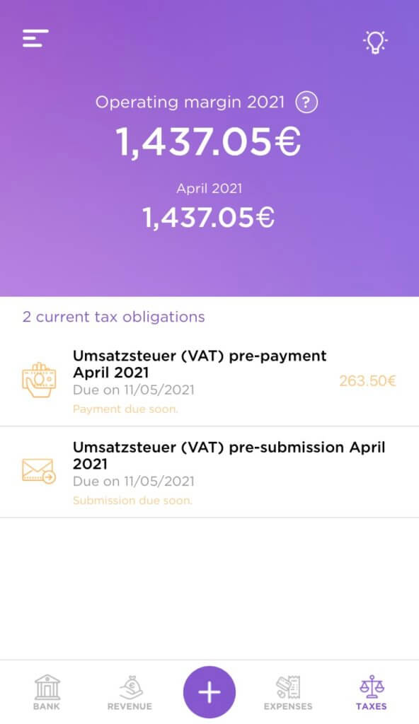The amount of VAT you have to pay is calculated from the sum of your income entered in the app minus your business expenses.