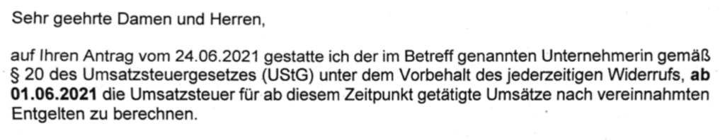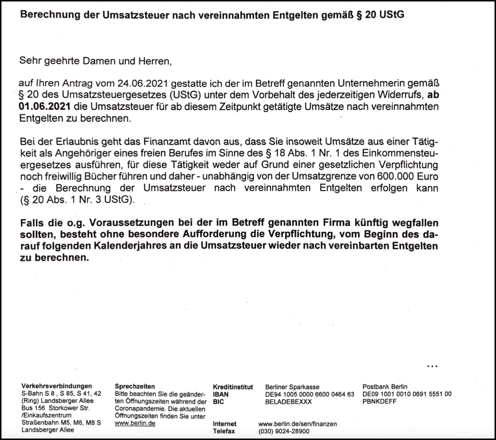 The letter you received tells you about your status concerning Istversteuerung and Sollversteuerung. You're wondering what the hell that means? It's actually not too complicated. The Sollversteuerung (debit taxation) is "taxation according to agreed charges", while Istversteuerung (actual taxation) is "taxation according to received charges."