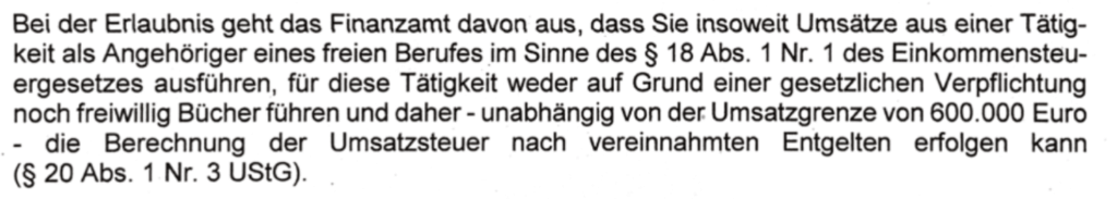 The next part explains why you are eligible for Istversteuerung, and don't need to do Sollversteuerung. Mainly, because for your freelance-work, you will use the profit & loss statement in order to compute your profit (and not double-entry bookkeeping) and you didn't make more than 600.000€ in the previous year.